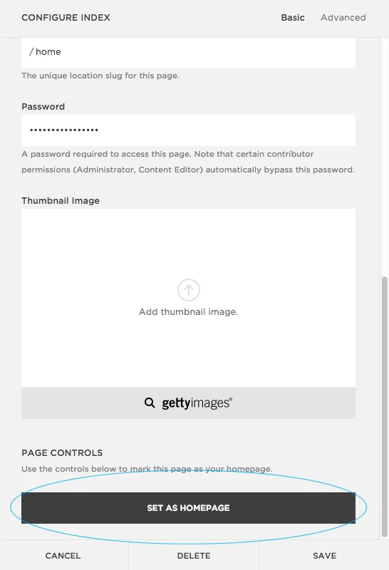 Then, on just the 'Home' page scroll down in the settings and set it as the homepage.